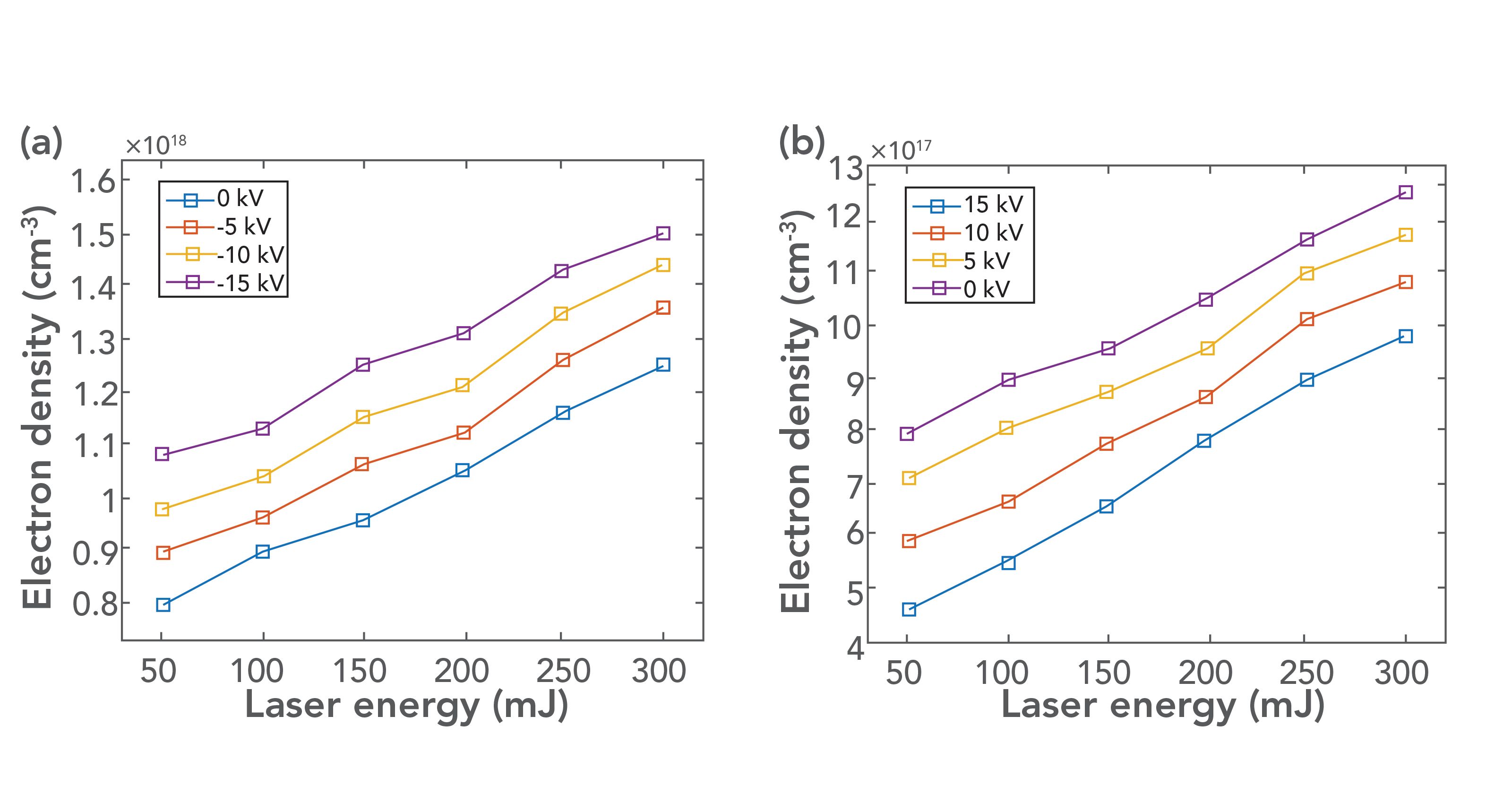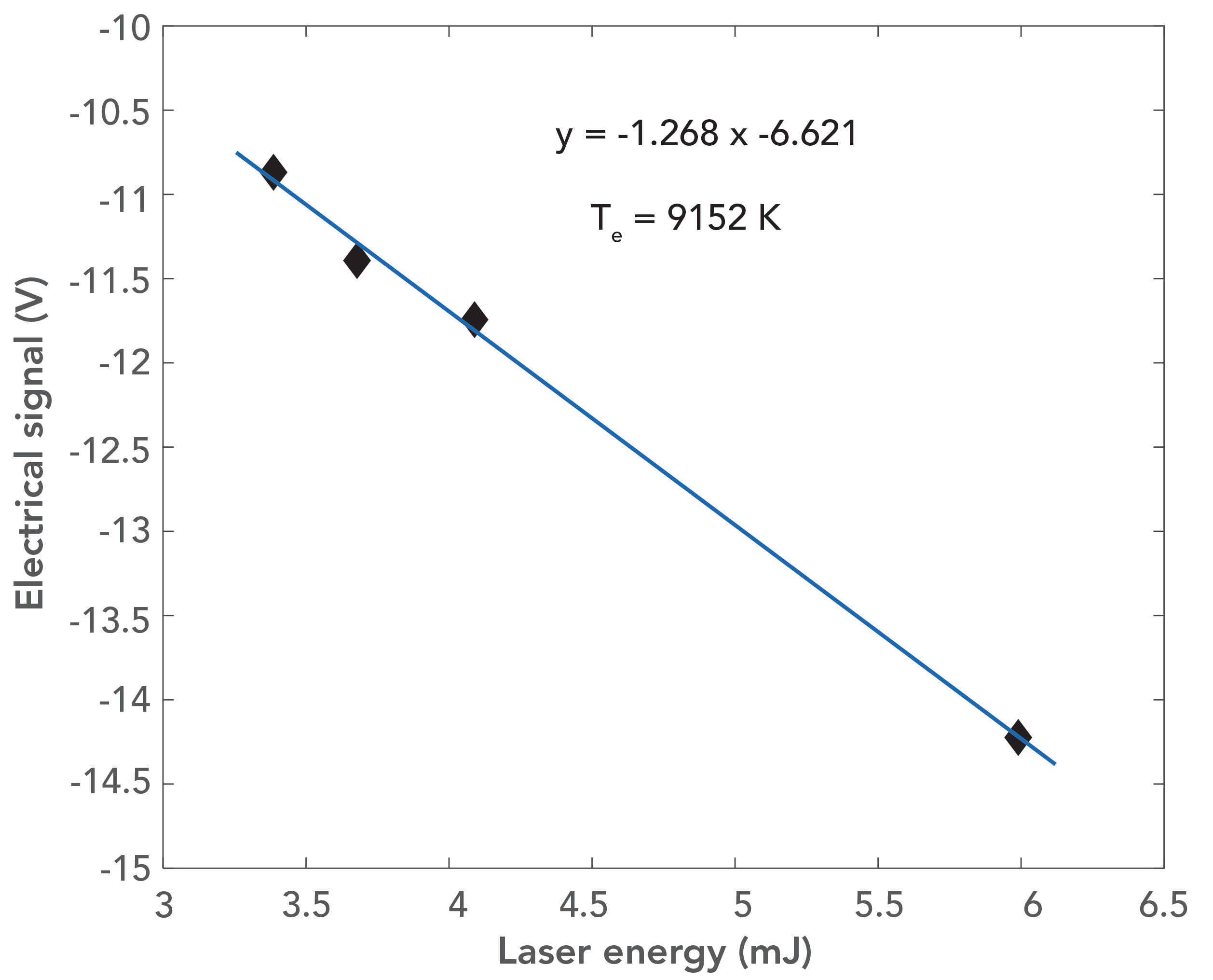 Alvarez and his coauthors (38) published a report on the spectral and electrical characterization of laser produced plasma. They studied the influence of transverse electric field produced by two parallel capacitor plates on the aluminum target. Their results showed that the electron temperature and density are directly proportional to the applied laser energy. They also recorded that the electric signal as a function of the distance of separation of the plates had a relationship, which is approximately the inverse of the square of the distance.