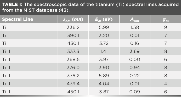 From the Saha-Boltzmann equation, plotting the expression at the right-hand side of the equation (Em) against the expression in the left-hand side of the equation gives a linear fit with a slope which is equal to -1⁄(kBT). Where kB and T are the Boltzmann’s constant and the plasma temperature respectively. Using the spectroscopic parameters of the titanium spectra lines acquired from the NIST database as shown in Table I. The plasma temperature can be deduced from the slope of the Saha-Boltzmann plot, as depicted in Figure 8.