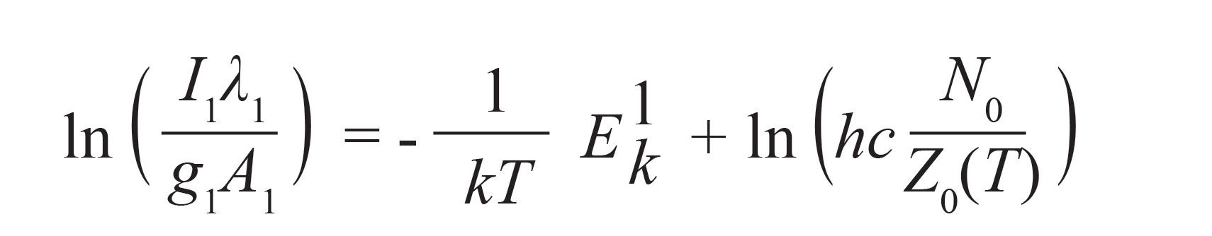 The plasma temperature of the laser-induced titanium plasma with and without applied electric field can be deduced from the Saha-Boltzmann equation used in our previous work (35). From the neutral and the ionic lines for the titanium spectra lines, we employ the Saha-Boltzmann plot method to calculate the plasma temperature of the laser-induced plasma. Equations 1 and 2a can be used to express the neutral and the ionic lines respectively (39–42).