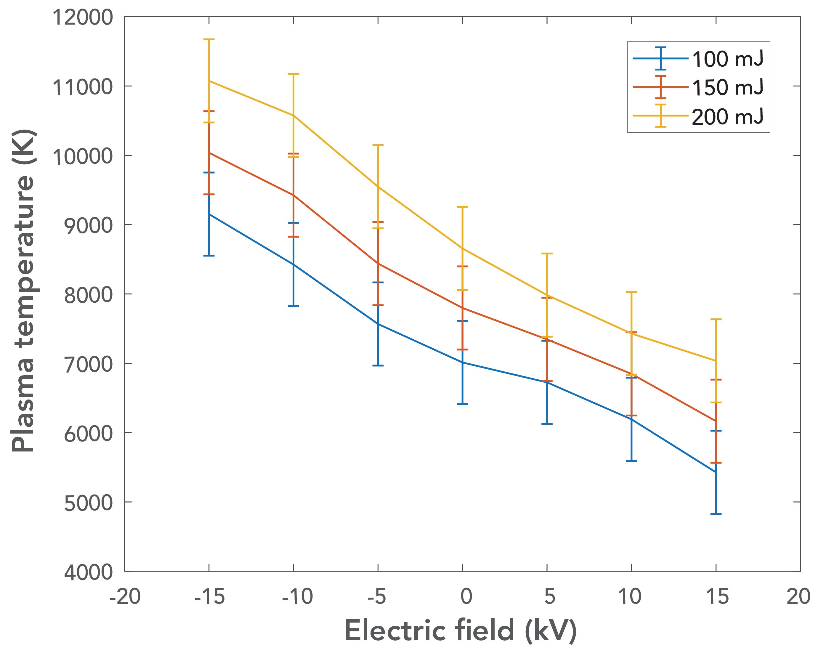 Figure 9 represents a plot of plasma temperature against applied electric field with different laser energies. The plasma temperature of the titanium plasma without electric field was recorded to be 7012 K at a laser energy of 100 mJ. From Figure 9, we can see that the plasma temperature increases with increasing laser energy under both positive and negative biasing voltages. However, comparing the positive and negative biasing voltages, the plasma temperatures of the negative biasing cases were more enhanced as compared to the positive biasing cases. Comparing the plasma temperatures of the positive biasing cases with the case without electric field, it was observed that the plasma temperature decreases in the presence of positive electric fields. At an applied electric field of -15 kV and a laser energy of 200 mJ, the plasma temperature was found to be 11274 K. Also, for the positive biasing voltage of 15 kV at the same laser energy of 200 mJ, the plasma temperature was also calculated to be 7035 K. Figure 9 shows that the plasma temperature drops tremendously from the negative biasing voltage of -15 kV to positive biasing voltage of 15 kV.