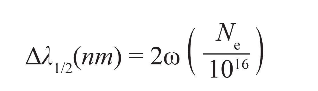 where ND is the number of particles in the Debye sphere, Ne is the electron density, ω and A are the electron impact width parameter and ionic broadening parameter, respectively. Ignoring the contribution of the ionic broadening, the expression in equation 3 can be written as (35,39):