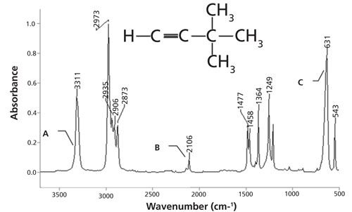 The C≡C linkage in monosubstituted alkynes has a stretching peak between 2140 and 2100, which is shown in Figure 6 labeled B at 2106. This is a very unusual peak position, which should make this peak a useful group wavenumber. However, like the C=C stretch of alkenes (11) this peak has variable intensity and hence limited utility because it may be intense, weak, or nonexistent depending on the molecule. Recall that one of the things that determines peak intensity is the change in dipole moment with respect to bond length (dµ/dx) for a vibration (8). For a monosubstituted alkyne with a polar substituent dµ/dx will be large and the C≡C stretching peak will be large. For a monosubstituted alkyne with a nonpolar substituent like tert-butyl acetylene, dµ/dx will be small and hence the peak intensity will be small as seen in Figure 6. For a symmetrically substituted alkyne such as acetylene (H-C≡C-H) dµ/dx for the triple bond stretch is zero and there is no IR peak due to C≡C stretching. The unreliable appearance of this peak makes it a poor group wavenumber. Again, the best peaks to identify a monosubstituted alkyne are the H-C≡C stretch and wag.