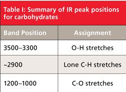 Notice then as we proceeded from mono- to di- to polysaccharides the spectra got more complex because of the many types of O-H and C-O bonds and eventually became so complex that the peaks overlapped enough to form blobs. Hydrogen bonding also helped increase spectral band broadening. The spectra of carbohydrates then are characterized by multiple O-H stretches and multiple C-O stretches. This information is summarized in Table I.