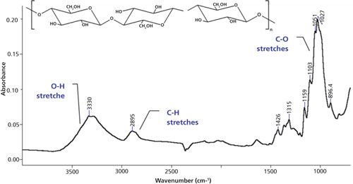Polysaccharides are polymeric carbohydrates consisting of many sugar units strung together. Perhaps the most common polysaccharide is cellulose, whose IR spectrum is shown in Figure 4.