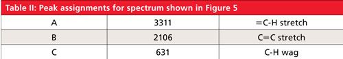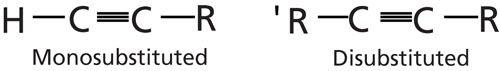 In past columns (10,11) we discussed unsaturated carbons and looked at the spectra of two families of unsaturated hydrocarbons, substituted benzene rings and alkenes. I left out one last family from the discussion, alkynes. Alkynes contain the C≡C structural unit, properly called a carbon-carbon triple bond. These bonds are unsaturated because they can be hydrogenated to form saturated compounds just like aromatic rings and alkenes (2). The two varieties of alkynes, monosubstituted and disubstituted, are shown in Figure 5. The “R-” symbols in Figure 5 represent nonhydrogen substituent atoms.