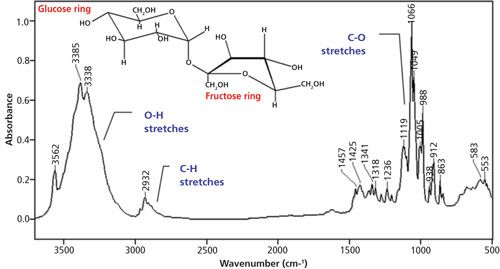 The IR spectrum of a disaccharide, sucrose, otherwise known as table sugar, is shown in Figure 3.