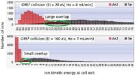 Optimizing Efficiency of KED for the Removal of High-Intensity Backgrounds: If lower level analysis of severely interfered elements such as Se, Fe, S, and P is required, the normal He-mode conditions outlined earlier cannot always provide sufficient reduction of the intense plasma-based interferences on these elements. Previously, these elements would have been measured using reactive cell gases such as H2, using an additional cell gas step. The new cell design of the system discussed here (the ORS3 ) can be operated with a higher cell gas flow rate and bias voltage than its predecessor (the ORS2 ). This has the effect of further reducing the overlap between the residual kinetic energies of the polyatomic and analyte ions at the cell exit, thereby allowing more efficient separation between the two groups of ions. The principle of operation of this high flow rate and high ion energy separation in the ORS3 is illustrated in Figure 4 for the removal of the Ar2 interference on 78 Se.