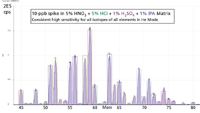 By comparing the mass spectra obtained with no cell gas and a single set of helium (He) mode conditions, the removal of multiple interferences was investigated in a complex matrix containing 5% HNO3, 5% HCl, 1% H2SO4, and 1% propan-2-ol (IPA). These matrix components (N, Cl, S, and C) were chosen because they represent common sample constituents and are each known to result in problematic polyatomic interferences in the mass range 44 amu to 81 amu. All isotopes of all elements in this mass range were measured, covering the preferred isotopes of Sc, Ti, V, Cr, Mn, Fe, Co, Ni, Cu, Zn, Ga, Ge, As, and Se, which are among the most interfered elements typically measured by ICP-MS. The effectiveness of He mode in reducing all interferences in this mass range was evaluated, and maintenance of good ion transmission was confirmed by analysis of all elements in this mass range in a spike at 10 ng/mL in the same matrix.