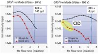 This spectrum comparison demonstrates the applicability of He mode with kinetic energy discrimination (KED) for multielement analysis of elements at the low parts-per-billion (nanogram-per-milliliter) levels typically measured in many common applications, such as environmental monitoring and food safety applications. However, in some cases certain analytes (notably Fe, Se, P, and S, which suffer from intense plasma-based interferences) must be measured at lower levels than is possible using conventional He mode. A recent refinement of the cell used in ICP-MS instruments (such as the 7700 Series, Agilent Technologies, Santa Clara, California) has resulted in a dramatic improvement in the He mode detection limits that can be achieved for these previously difficult elements by using modified conditions with higher cell gas pressure and higher energy discrimination voltages.