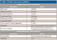 The general approach to the removal of polyatomic ions using He cell gas and kinetic energy discrimination has been discussed elsewhere (2,7) and the previously established He flow rate and KED voltages were used for this work (5-mL/min He cell gas flow and 4-V energy discrimination).