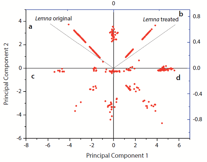 Figure 3: Principal component analysis (PCA) plot of features occurring in untreated Lemna minor sample extract versus L. minor sample extract treated with 10-µM diclofenac: (a)Dots represent the compounds related positively to untreated sample and negatively to treated sample; (b) dots represent compounds that are positively related to both samples; (c) dots represent compounds that are negatively related to both samples; (d)dots represent compounds related positively to treated sample and negatively to untreated sample.
