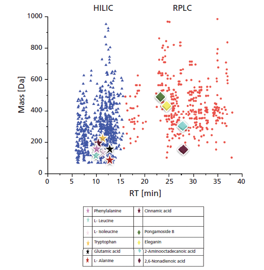 Figure 1: Retention time versus mass plot of Lemna minor extract (of an untreated sample). Blue triangles represent hydrophilic interaction liquid chromatography (HILIC)-retained molecules eluted from 0 to 15 min; red circles represent reversed-phase LC-retained molecules eluted from 16 to 38 min. Different colored and shaped dots represent examples of identified (stars) and expected (diamonds) compounds, as indicated in the legend.