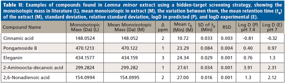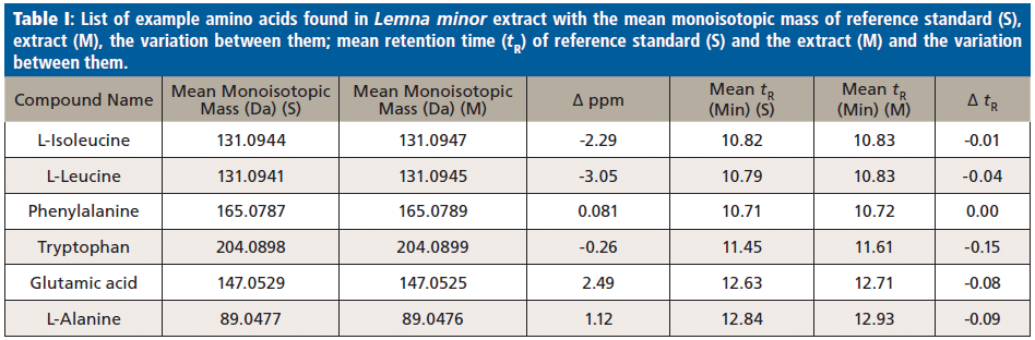Furthermore, tryptophan, leucine, and isoleucine (as shown in Figure 1) were identified similarly. After excluding the positive logD results, the remaining hits with negative logD values were either the corresponding amino acid, or various synthetic compounds. Later hits are typically anthropogenic (brought into the environment), and cannot be originated in the plant, thus they were neglected in this study. Reference standards for the remaining amino acids were injected to prove the identity and presence in the L. minor extracts, which also were reported previously in the literature (24). Finally, for the successful application of the hidden-target screening strategy (7) using the compound database STOFF-IDENT, amino acid standards were available, directly confirming the hits of expected amino acids in L. minor methanol extracts. The amino acids identified are phenylalanine, L-leucine, L-isoleucine, tryptophan, glutamic acid, and L-alanine, as labeled in Figure 1. The amino acid standards were injected in triplicate, and the mean of each standard mass (S) and retention time were calculated. The identification was done through comparing the differences between the mean retention times of the standard and extract, which was in the range of 0 min (phenylalanine) to 0.15 min (tryptophan). Moreover, the mass variation between the standard mass (S) and the extract mass (M) is less than 5 ppm. In Table I, the six identified amino acids were listed with their mean isotopic mass and mean retention times. In addition, standards mean isotopic mass and retention times were calculated for the three injections.