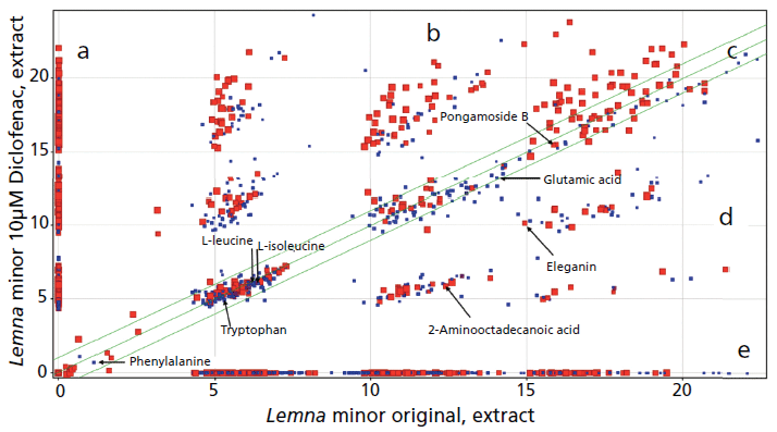 Figure 2: Feature (signal intensity) comparison plot of an extract using original untreated Lemna minor sample versus an extract of L. minor sample treated with 10 µM of diclofenac. Examples of found amino acids and expected compounds are found in both samples. Small blue squares represent retention time (tR) (0-15 min) and big red squares represent the tR (16-38 min) of (a) compounds only found in the Lemna sample treated with 10-µM diclofenac extract; (b) compounds found in both samples with increased feature intensity in treated compared to untreated Lemna samples; (c) compounds found in both samples; (d) compounds found in both samples with decreased feature intensity in treated compared to the untreated Lemna sample; and (e) compounds only found in the untreated Lemna sample extract.