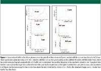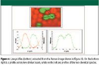 What can this Raman image tell us about the spatial resolution of the measurement? Clearly, the morphology of the spheres is well replicated. But what about the contrast in the image? Consider two line profiles extracted from this image — one taken across two like particles, and one across two dissimilar particles. Figure 4 shows the Raman image with two lines, indicating the track over which line profiles were extracted. When the track traversed the green beads, the profile shows a double hump and the width of the beads would be determined by bandfitting. This profile looks like that used to define the Rayleigh criterion for detection of two particles. On the other hand, when the track traversed beads of different chemistries, one does not have to define or invoke any mathematical definition to determine the bead size. It would be measured directly as the FWHM of the profile, and perhaps more importantly, the contrast is high. In summary, the difference in chemistry provides contrast in the chemical image that is not possible in a standard microscopic image.