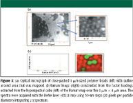 In the past, it was conventional (and conservative) to say that the spatial resolution of the Raman microscope is about 1 μm. It is clear that the technology does much better than that. How else can it be tested? What would happen if we looked at polymer beads of different chemical composition? The next experiment to be tested was to acquire maps of 1-μm beads of a mixture of polystyrene and polymethylmethacrylate. In spite of the fact that polymers often do not like to mix, it was possible to identify a region with beads of the two components. Figure 3a shows a layer of close-packed spheres, with a highlighted rectangular area where Raman mapping was performed. Figure 3b shows the Raman map constructed from the factor loadings generated from multivariate analysis.