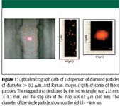 A sample that was known to have particles of diamond with diameters of 0.2 μm (200 nm) or larger was mapped with the HeNe laser (632.8 nm). For this sample, Raman maps should be acquired with steps of about 40 nm (five points per particle), but a stage with only 100-nm (0.1-μm) steps was available. The result, shown in Figure 1, was an image of a particle whose FWHM was no greater than 0.4 μm! Because this quantity represents a convolution of the beam profile and the particle size, which was 0.2 μm, the beam profile must be somewhere in the range of 0.2 to 0.3 μm, considerably smaller than the prediction from diffraction theory.