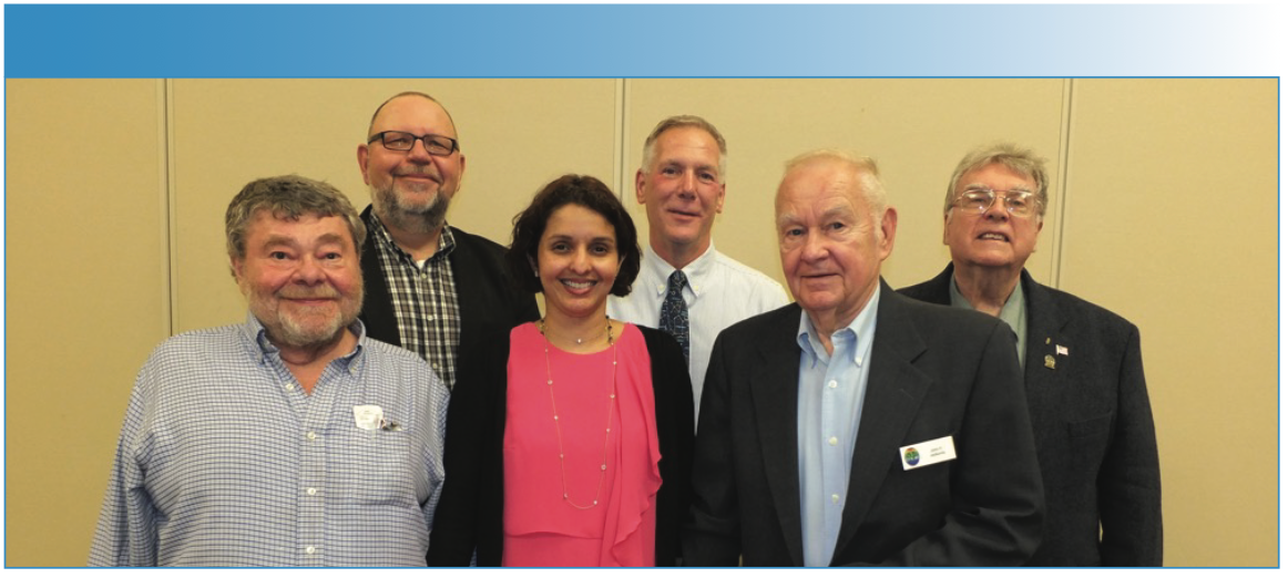 Group photo at the Spectroscopy Society of Pittsburgh monthly meeting where Sharma was the invited speaker. L to R: Front Row: Sandy Asher, Bhavya Sharma, and the late John Jackovitz. Second Row: Chuck Gardner, Don Antczak, and Kerry Holzworth, September 2017, Pittsburgh, Pennsylvania.