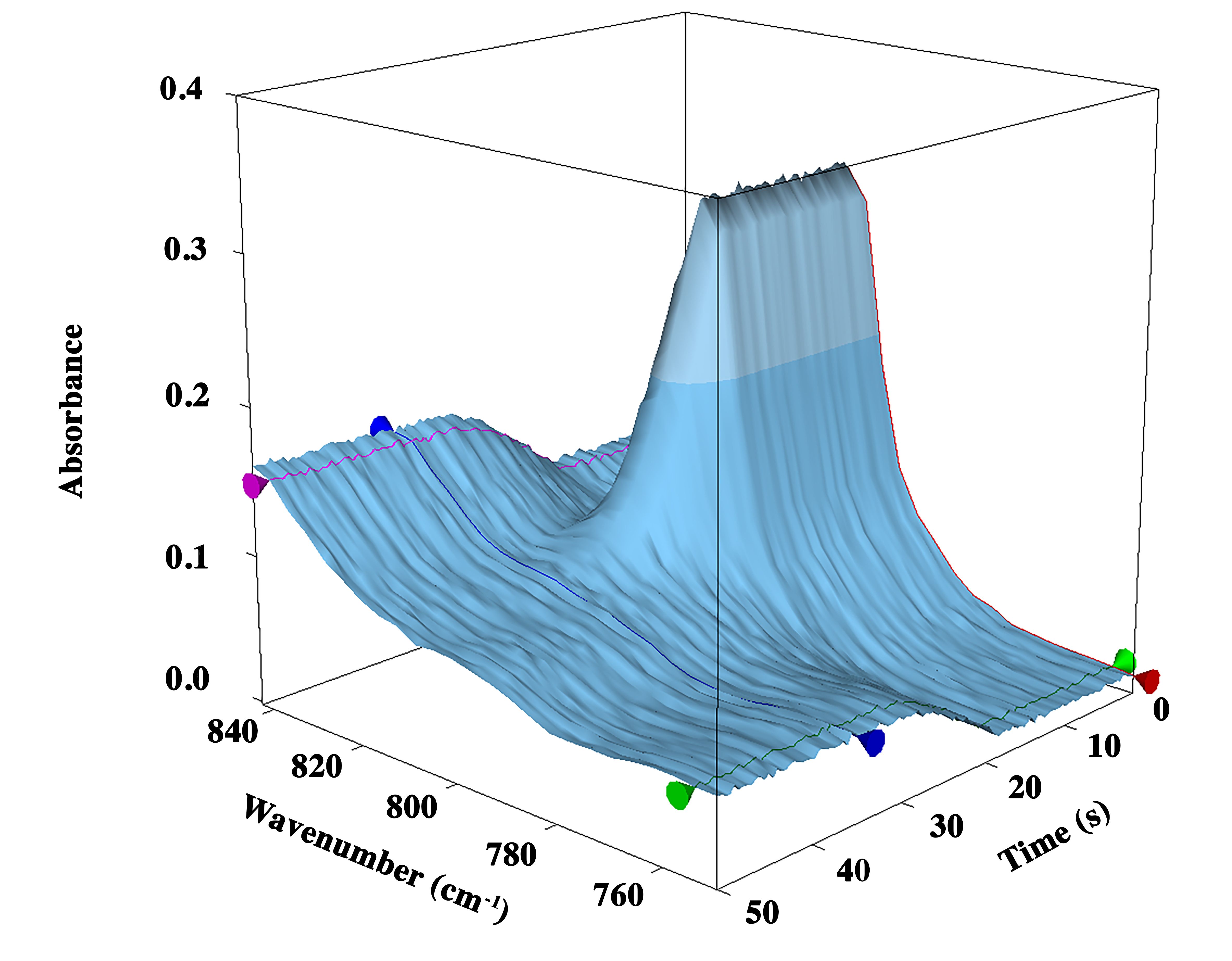 Figure 2: Acrylate photopolymerization using 405 nm light. Waterfall plot showing the band change over time. Irradiation began at 19 s.