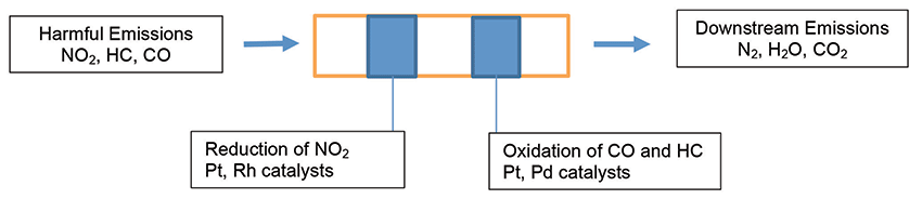 Figure 2: Three reactions take place in a three-way catalytic converter. One is the reduction of nitrous oxide into nitrogen and oxygen, the second is the oxidation of carbon monoxide to carbon dioxide, and the third is the oxidation of hydrocarbons and oxygen into carbon dioxide in water (2).