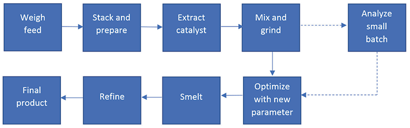 Due to initiatives for environmental legislation and the low availability of these three PGMs in nature, platinum, palladium, and rhodium are heavily recycled, and can be recovered with approximately 95% efficiency (13). These three PGMs are mostly recycled from catalytic converters, as shown in the process presented in Figure 4.