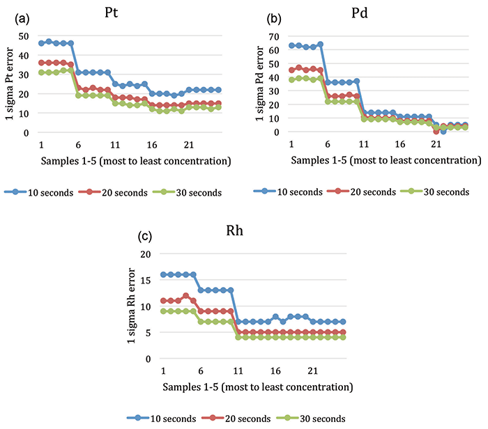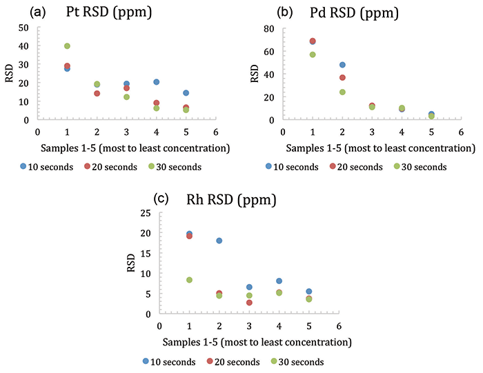The results for Pt, Pd, and Rh show that, overall, the relative standard deviation decreases as measurement time increases. This is most pronounced in Pt at low concentrations (note standard numbers 3, 4, and 5 assayed to 1200, 700, and 300 ppm, respectively). Catalysts, in general, do not exceed 10,000 ppm concentration levels for any of these three elements.