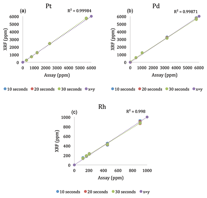 Figure 6: The charts show accuracy with the assay (ppm) on the x-axis and the XRF analysis results (ppm) on the y-axis. The illustration shows (a) Pt accuracy, (b) Pd accuracy, and (c) Rh accuracy.