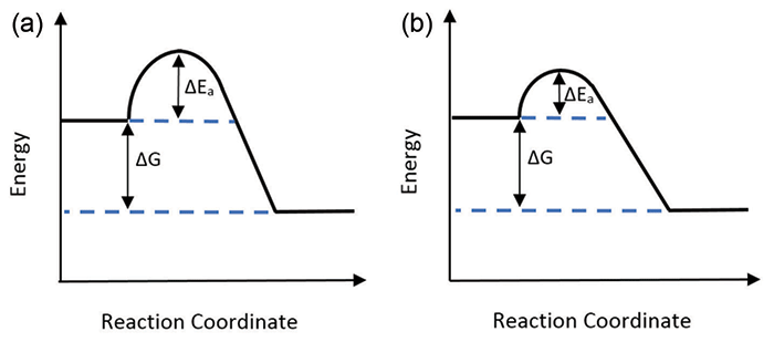 Figure 1: The activation energy (Ea) of a chemical reaction, (a) without a catalyst, and (b) with a catalyst. This shows that the activation energy of a chemical reaction decreases and increases reaction speed, thus increasing product yield (2).