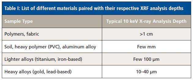Handheld XRF has methods that cater to different applications and different elements of interest. X-ray analysis depth is dependent on the physical properties of the sample and the information reaching the detector (Table I).