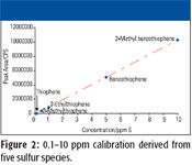 Wherever possible, sulfur species were identified in the FCC naphtha and gasoline samples using spiking experiments with known standards. However, similar sensitivity responses were observed for each thiophene standard — that is, as calculated from each fully quantitative external calibration curve. This observation is illustrated in Figure 2, which shows a sulfur calibration in the region of 0.1–10 ppm using calibration standards derived from five sulfur species.
