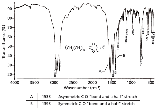 The infrared spectrum of a carboxylate, zinc stearate, is shown in Figure 2. This molecule is made by reacting two equivalents of stearic acid with the dibasic zinc hydroxide, yielding a molecule with two carboxylate moieties.