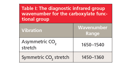Because carboxylates contain positive and negative charges, they are highly polar and have a large dipole moment. Recall from the first installment of this column that one of the characteristics that determine infrared peak positions is the change in dipole moment with respect to bond distance during a vibration, or dµ/dx (6). When the bonds of the -CO2– group stretch asymmetrically and symmetrically there is a large value of dµ/dx. This attribute is why the pair of carboxylate stretching peaks are so intense.