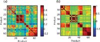 Figure 4: Correlation map of the baseline-treated Raman spectra of tablets containing atorvastatin calcium trihydrate (product numbers 1â13), cetirizine hydrochloride (numbers 14â20), ciprofloxacin hydrochloride (numbers 21â37), loratadine (numbers 38â41), risedronate sodium (numbers 42â47), valsartan/hydrochlorothiazide (numbers 48â57), and valsartan (numbers 58â65) measured using (a) the handheld instrument and (b) the laboratory-based instrument.