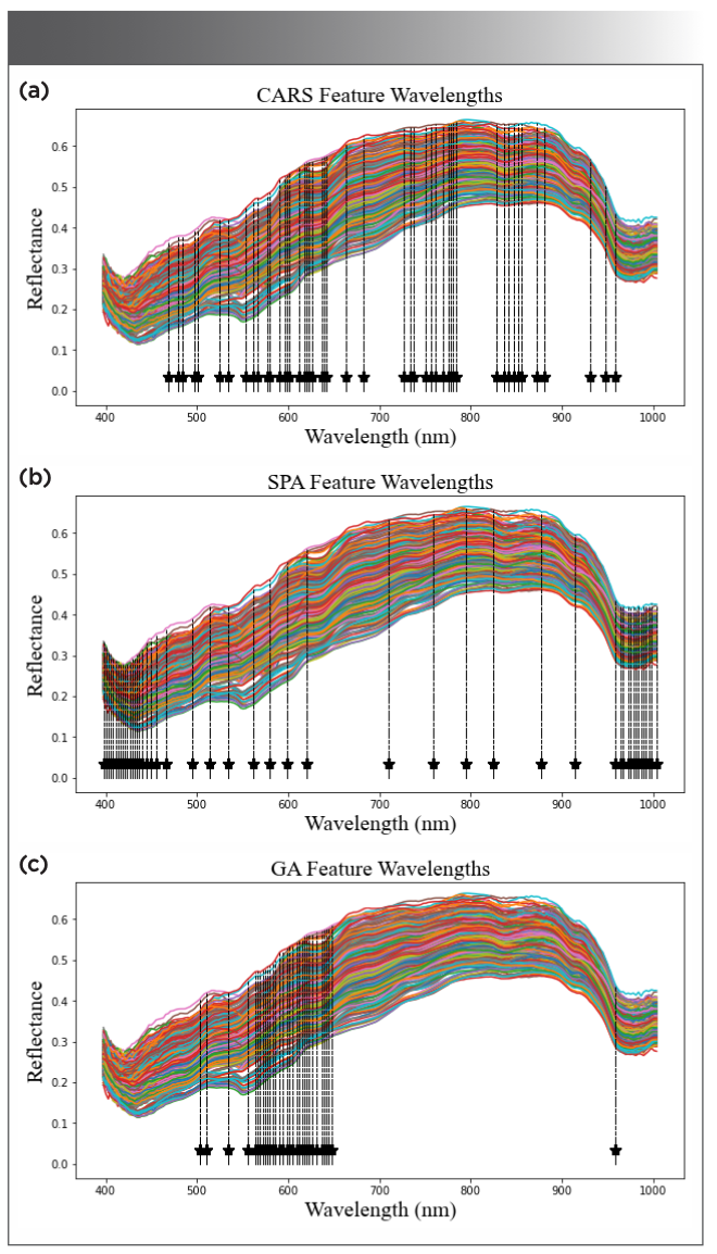 FIGURE 7: VNIR spectra feature wavelengths: (a) CARS, (b) SPA, and (c) GA.