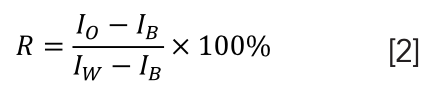 R is the corrected image, IO is the original image, IB is the standard blue reference image, and IW is the standard white reference image.