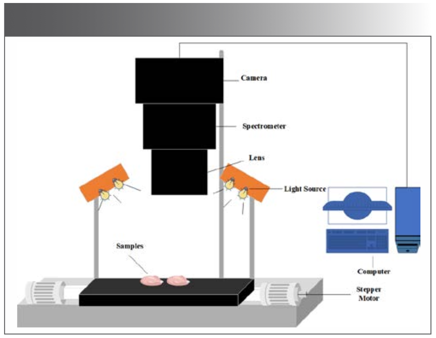 Prior to engaging in hyperspectral image acquisition, it is imperative that the system be allowed a warm-up period of 30 minutes. This precautionary measure is instituted to prevent the incursion of extraneous noise in the data. Subsequent to the fine-tuning of the system parameters, the chicken breast specimens were carefully positioned on a non-reflective black tray. This tray was then placed on the stepper, and the acquisition phase was completed in approximately 60 s.