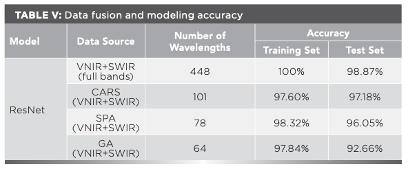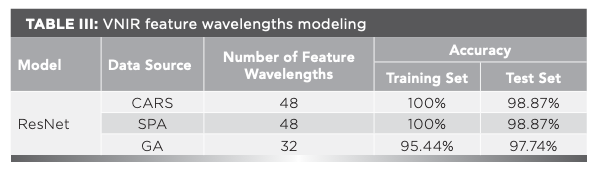 Furthermore, feature wavelength selection using CARS and SPA reduces the number of spectra bands to 48. As illustrated in Table III, in the VNIR region, when CARS and SPA were employed for feature wavelength selection and ResNet was used for modeling, the accuracy slightly increased from 98.31% to 98.87%. However, when GA is applied for feature wavelength selection, the accuracy exhibits a minor decrease.