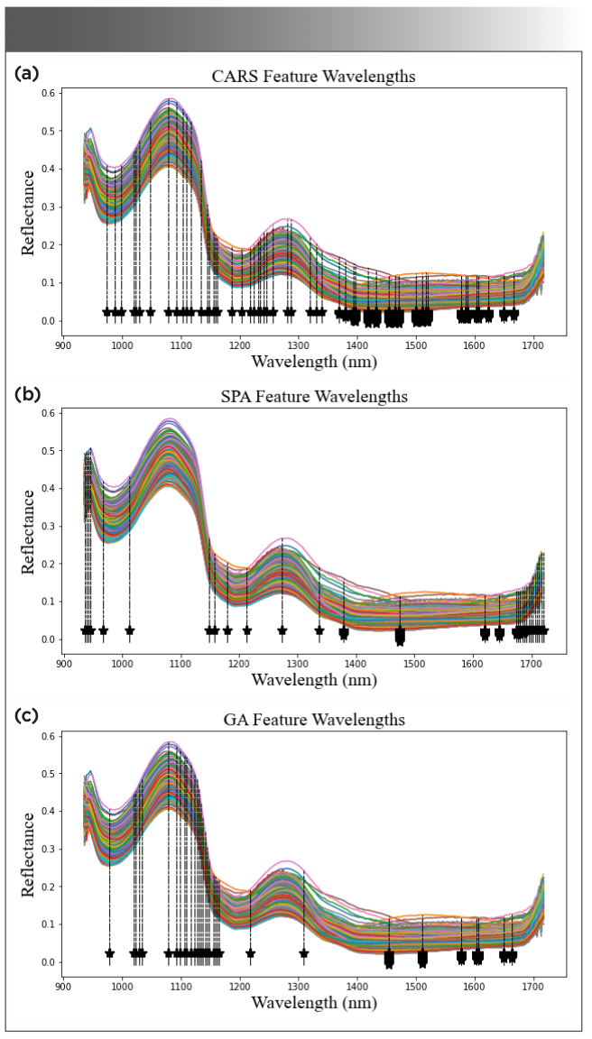 FIGURE 8: SWIR spectra feature wavelengths: (a) CARS, (b) SPA, and (c) GA.