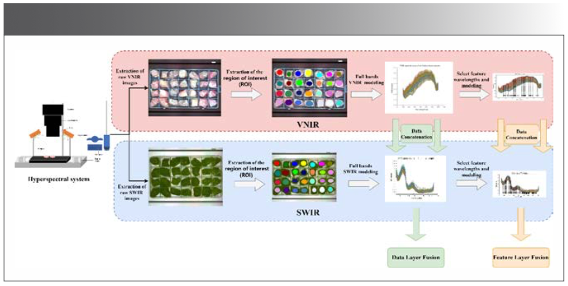 Data fusion, otherwise referred to as information fusion or multi-source information fusion, is a meticulous process of assimilating and synthesizing information derived from various sensors or data streams, thereby yielding more useful or accurate outcomes. The overarching goal of data fusion is to capitalize on the benefits offered by multiple data streams while minimizing the uncertainty introduced by measurement inaccuracies, noise, and data incompleteness. This process encompasses multi-level processing. Data fusion can be categorized into three distinct levels: data-level fusion, feature-level fusion, and decision-level fusion (36). The comprehensive spectral data sets of VNIR and SWIR are utilized to develop the data-level fusion model, while the selected feature wavelengths are applied in the creation of the feature-level fusion model.