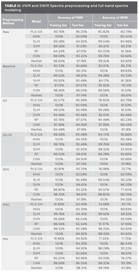 In the SWIR region, as shown in Table IV, the accuracy significantly decreases after feature wavelength selection and modeling using the selected feature wavelengths. This phenomenon may be attributed to the loss of essential spectra information for modeling and classification after feature selection in the SWIR region. Consequently, the selected features fail to adequately represent the key information present in the full-band spectra data, leading to a degradation in model performance.