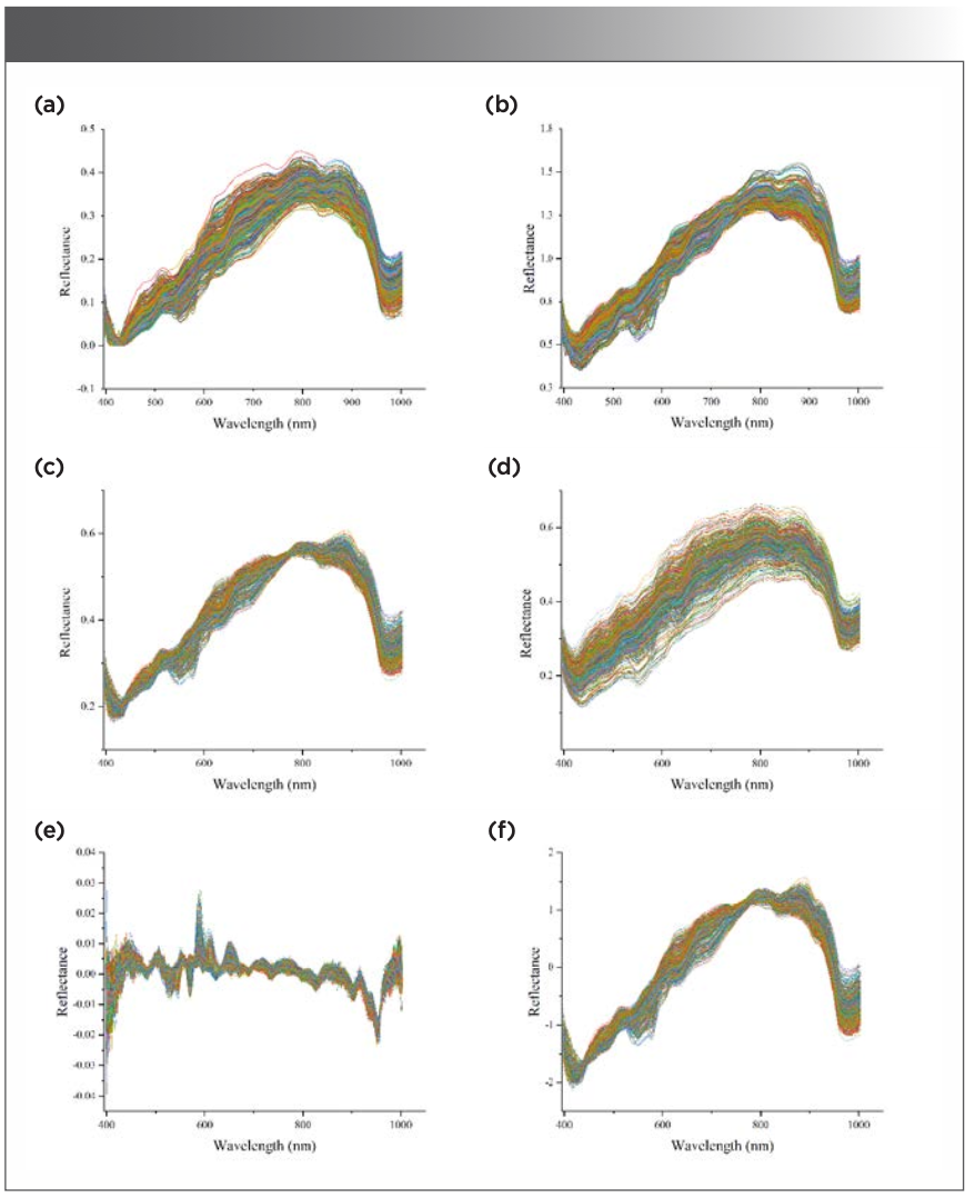 FIGURE 5: VNIR spectra: (a) Baseline-preprocessed, (b) MN-preprocessed, (c) MSC-preprocessed, (d) SG-preprocessed, (e) SG-1D-preprocessed, (f) SNV-preprocessed.