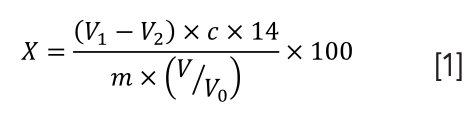 The quantification of TVB-N content was conducted in adherence to China’s national standard for food safety, GB/T 5009.228-2016, employing the semi-micro nitrogen assay method. The volatile saline nitrogen content within the sample was computed by equation 1. In this equation, X is the VBN content expressed in mg per 100 g of the sample. V1 and V2 are the volumes of acid consumed in the titration by the sample and the blank, respectively, measured in milliliters. c represents the molarity of the acid solution used. The sample’s mass is denoted by m in grams, and the coefficient of 14 converts the acid volume to the equivalent nitrogen content in mg. The ratio V⁄V0 accounts for any dilution of the sample, where V is the volume of sample solution used for titration, and V0 is the initial volume of the sample solution prepared. The factor 100 scales the result to the conventional unit of measurement.