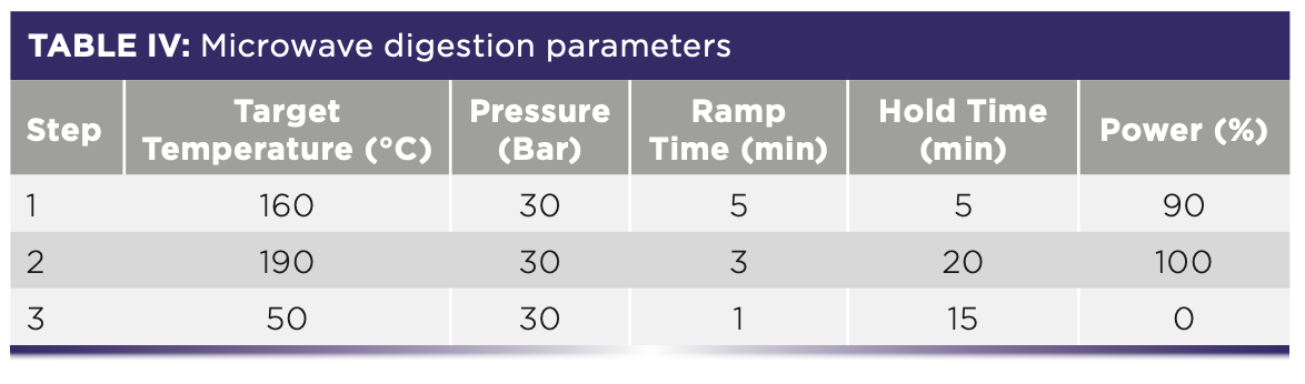 The precision was evaluated by the relative percent difference (RPD) of duplicated sample analysis. The duplicated samples were separately digested and went through the same sample preparation process as individual samples. These tests were performed on three CRMs. In all cases, the RPDs were within the QC acceptance criteria of <30% as specified in AOAC Table 2015.01F for all target elements, as shown in Table VI.