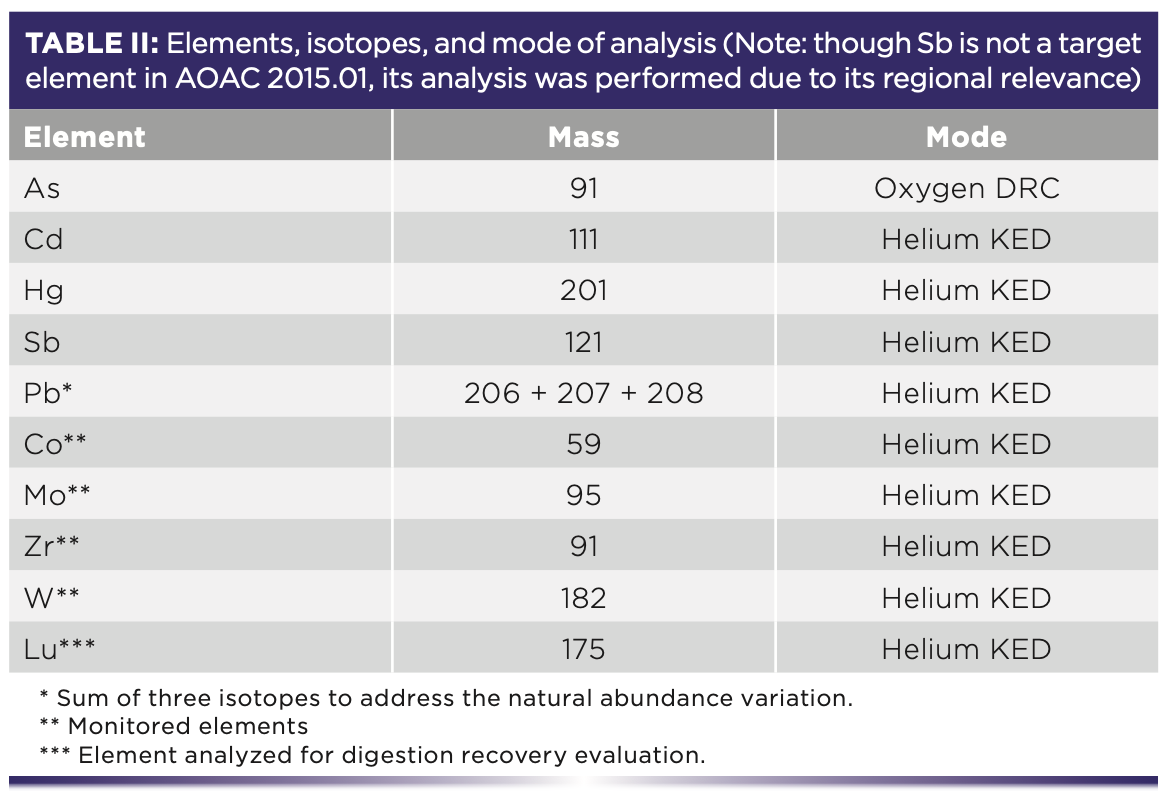 The elements being determined, their respective isotopes, and the mode of analysis used for each element in this method are listed in Table II. Cobalt, Mo, Zr, and W were monitored for interference evaluation. Among the analytes, As was measured as AsO in reaction (DRC) mode using oxygen as the cell gas, and the rest of the analytes were measured in collision (KED) mode using helium as the cell gas.