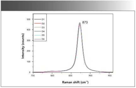 The self-built Raman spectrometer was calibrated daily with anhydrous ethanol (purity: 99.6%). The Raman peak at 873 cm-1 was attributed to the stretching vibration of C-C-O. Figure 2 shows the Raman spectra of anhydrous ethanol for six continuous days (D1–D6). The overlayed spectra of anhydrous ethanol reveals that the spectrometer employed here possessed good stability.