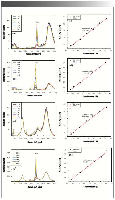 M- and p-nitrophenol in liquid phase with methanol as the solvent at different concentrations (0.3%, 0.6%, 1.2%, 1.8%, 2.4%, 3.0%, and 3.6%), and o- and p-nitrophenol in the liquid phase with acetone as the solvent at different concentrations (0.3%, 0.6%, 1.2%, 1.8%, 2.4%, 3.0%, and 3.6%) were measured. As shown in Figure 6a–h, the intensities of corresponding Raman peaks (1343, 1333, 1134, and 1333 cm-1) increased along with the increasing concentrations. The linear relationships between the intensities and concentrations were found, the corresponding linear correlation coefficients were 0.9965, 0.9971, 0.9933, and 0.9971, respectively. The detection limits of concentrations for m-nitrophenol and p-nitrophenol in the liquid phase with methanol as the solvent, and o-nitrophenol and p-nitro- phenol in the liquid phase with acetone as the solvent were 0.10%, 0.03%, 0.07%, and 0.20%, respectively.