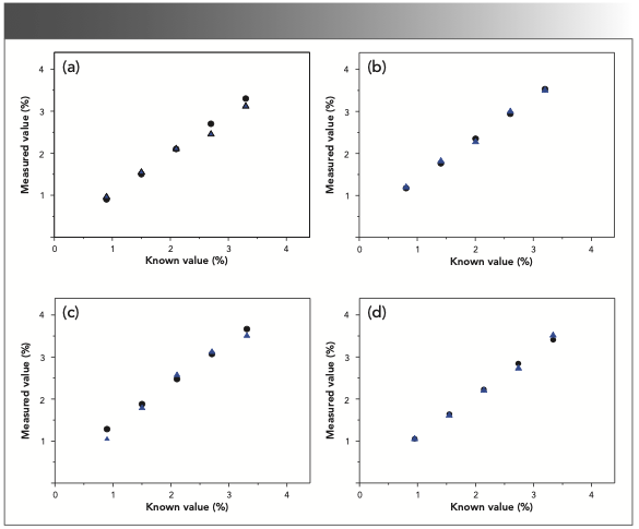 To verify the accuracy of four fitted linear relationships between Raman intensities and concentrations, nitrophenol isomers in the liquid phase with methanol or acetone as the solvent at known concentrations (0.9%, 1.5%, 2.1%, 2.7%, and 3.3%) were investigated, and the measured concentrations calculated by the fitted linear relationships were compared with the known concentrations. As observed in Figure 7a–d, the circle symbol represents the known values of concentrations, and the triangle symbol represents the measured values of concentrations. It revealed that these measured values of concentration were in good agreement with the known values, and average deviations were 4.94%, 2.69%, 4.37%, and 1.86%, respectively.