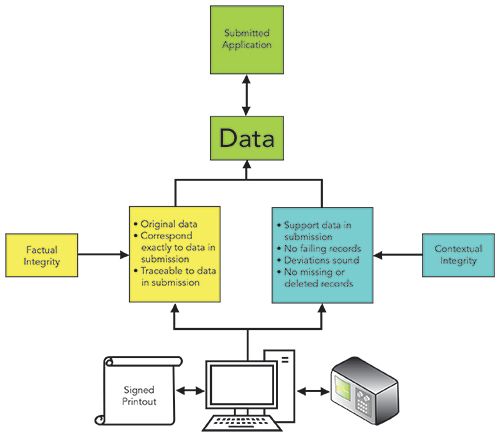 Figure 2 shows a hybrid spectrometer system at the bottom that has generated data and records that have been included in an application to the FDA at the top of the page. The journey from the instrument to the application takes two routes; one for factual integrity, and the other for contextual integrity. Factual integrity ensures a match between data and information in the application and the electronic records and associated paper printouts (for hybrid systems) in the data systems of the organizations’s laboratory. In contrast, contextual integrity is an assessment that the organization has not been selective or fraudulent in including data in an application. This concept of factual and contextual integrity provides a bridge between Objectives 2 and 3, as data integrity issues identified in the former provide an input to the latter.