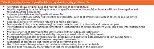 The new version of the CPG shows some indicators of possible laboratory data integrity problems and I have collated them in Table II. The aim of Objective 3 is to demonstrate the reliability of the data in a submission. However, if data are unreliable, the new CPG version suggests that an inspector can expanding the coverage of the inspection to marketed products under Compliance Program 7356.002 for Drug Manufacturing Inspections (7), or that the FDA invokes the Application Integrity Policy (8). If either of these occur, the laboratory has begun the long and very uncomfortable decent into inspection hell.