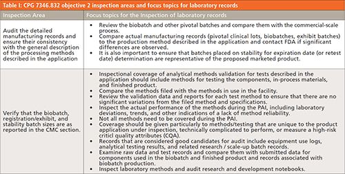 Unlike the first objective, with a neat and structured list of sub-objectives, the areas for inspection under this objective are presented like a shopping list. Table I lists the pertinent inspection areas for a regulated laboratory together with the inspection focus within each area. Please note that Table I is an edited list; please read the actual document for the full scope of Objective 2. Note that there is a recurring theme in this objective of checks from laboratory data on-site back to the application submitted by the organization.
